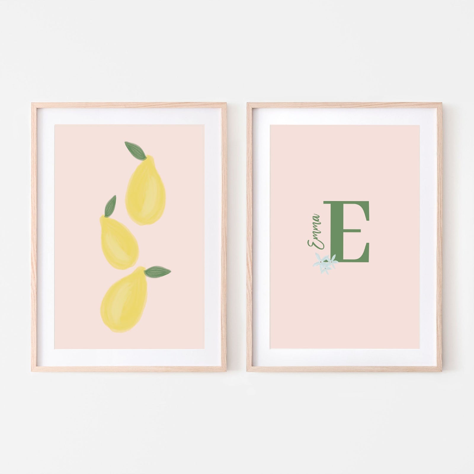 Sweeten up a little girls nursery, bedroom or playroom with this matching personalized name and leafy lemon print set.